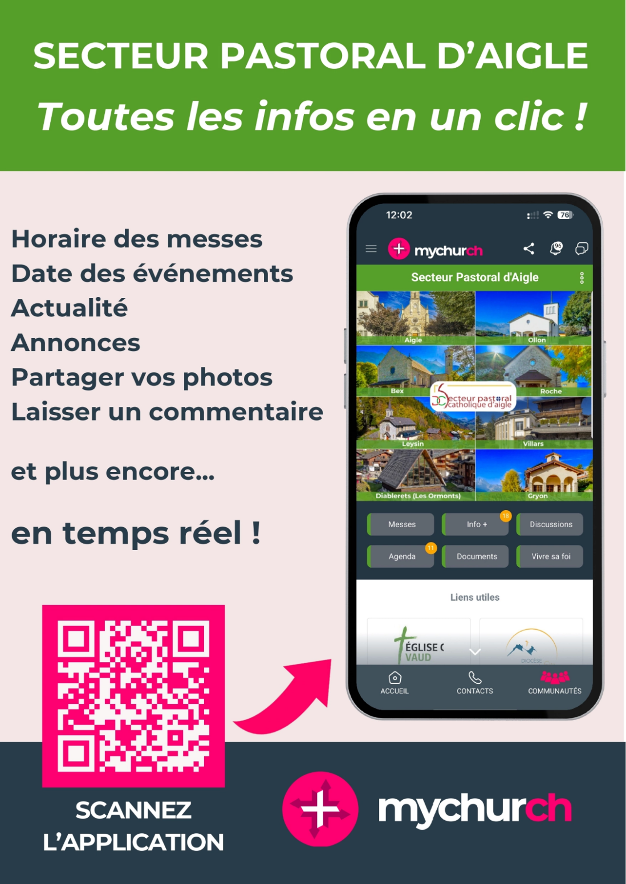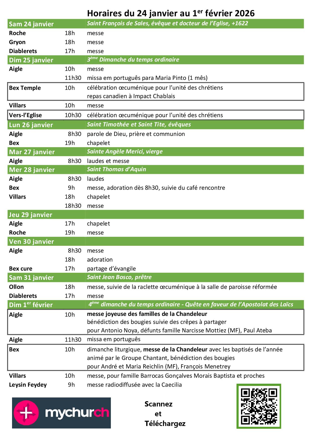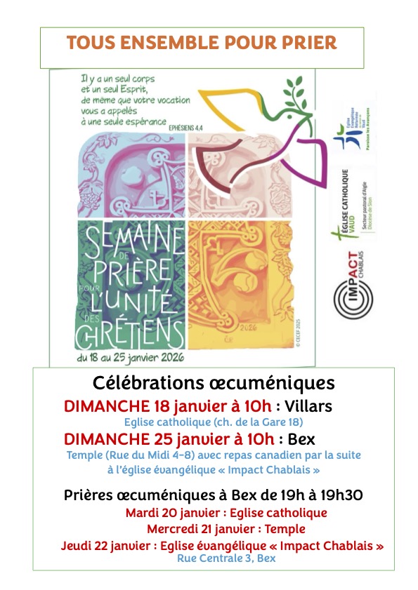 Infomesses du 24 janvier au 1er février Semaine de l’unité des chrétiens du 18 au 25 janvier My Church, la nouvelle application du secteur d’Aigle Messes intergénérations, samedi 17 janvier à 18h à l’église catholique de Bex Églises de Bex Bienvenue dans notre paroisse! Parcours de préparation à la confirmation (14-20 ans) Catéchèse pour enfants Rencontres des jeunes catholiques du secteur d’Aigle (18-35 ans) EcoEglise, notre communauté d’engage Newsletter et journal paroissial – inscription DÉCLAREZ VOTRE RELIGION AU CONTRÔLE DES HABITANTS Ecole catholique du Chablais, l’école qui croit en votre enfant! Article de Bernard Hallet – cath.ch Consultez l’article : L’église rénovée par Bernard Hallet, journaliste chez cath.ch Nouvel espace liturgique Une restauration délicate tout en finesse Nouvel espace culturel Inauguration église de Bex dès le 28 août 2021