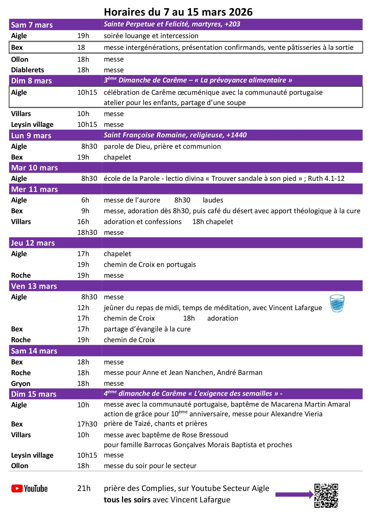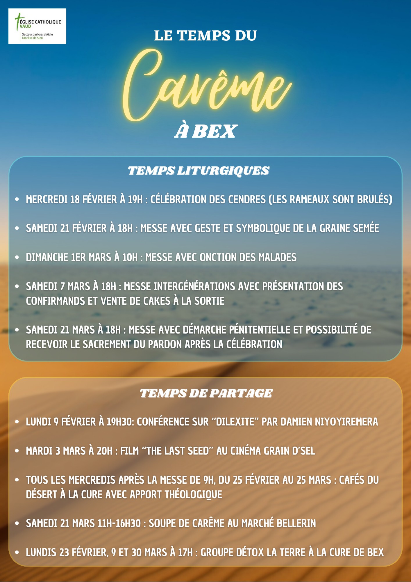 Action de Carême – vente solidaire Infomesses du 7 au 15 mars 2026 Vivre le Carême à Bex My Church, la nouvelle application du secteur d’Aigle Messes intergénérations, samedi 7 mars à 18h à l’église catholique de Bex Églises de Bex Bienvenue dans notre paroisse! Catéchèse pour enfants Rencontres des jeunes catholiques du secteur d’Aigle (18-35 ans) EcoEglise, notre communauté d’engage Newsletter et journal paroissial – inscription DÉCLAREZ VOTRE RELIGION AU CONTRÔLE DES HABITANTS Ecole catholique du Chablais, l’école qui croit en votre enfant! Article de Bernard Hallet – cath.ch Consultez l’article : L’église rénovée par Bernard Hallet, journaliste chez cath.ch Nouvel espace liturgique Une restauration délicate tout en finesse Nouvel espace culturel Inauguration église de Bex dès le 28 août 2021